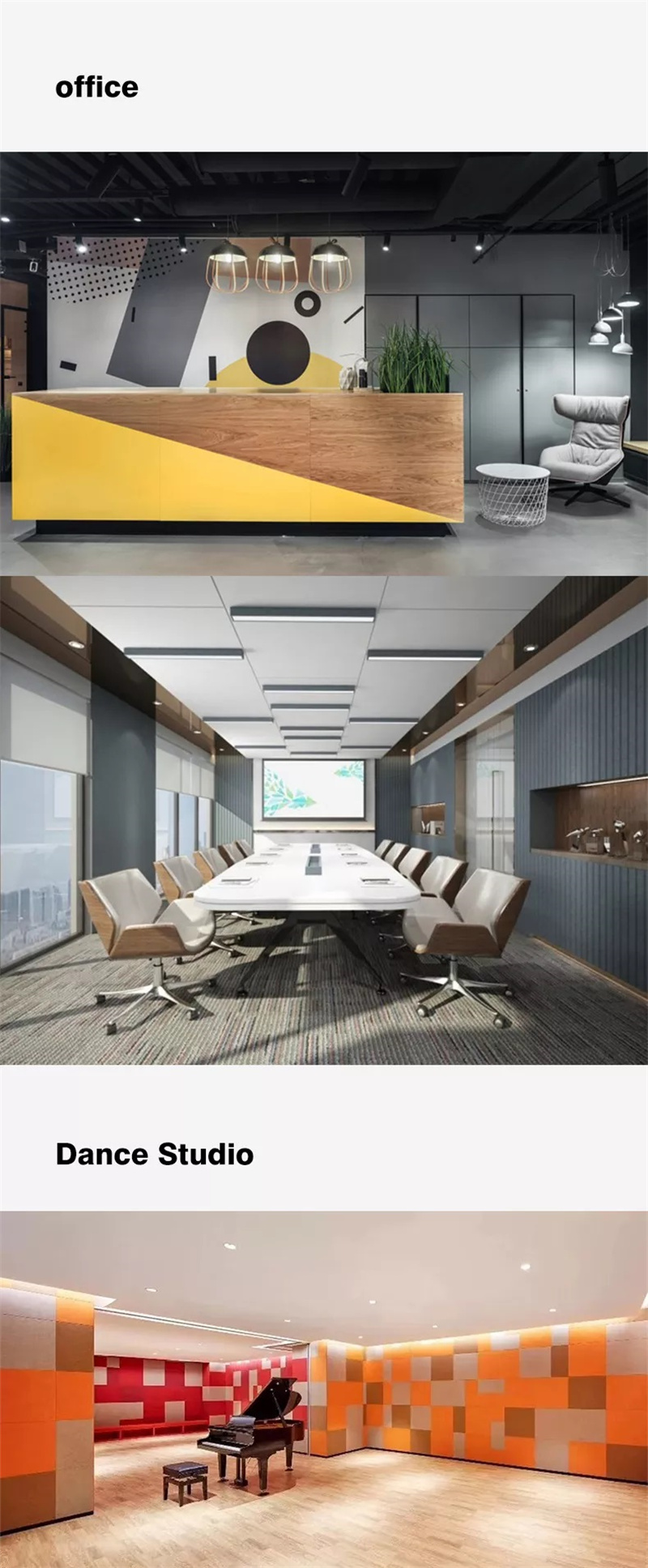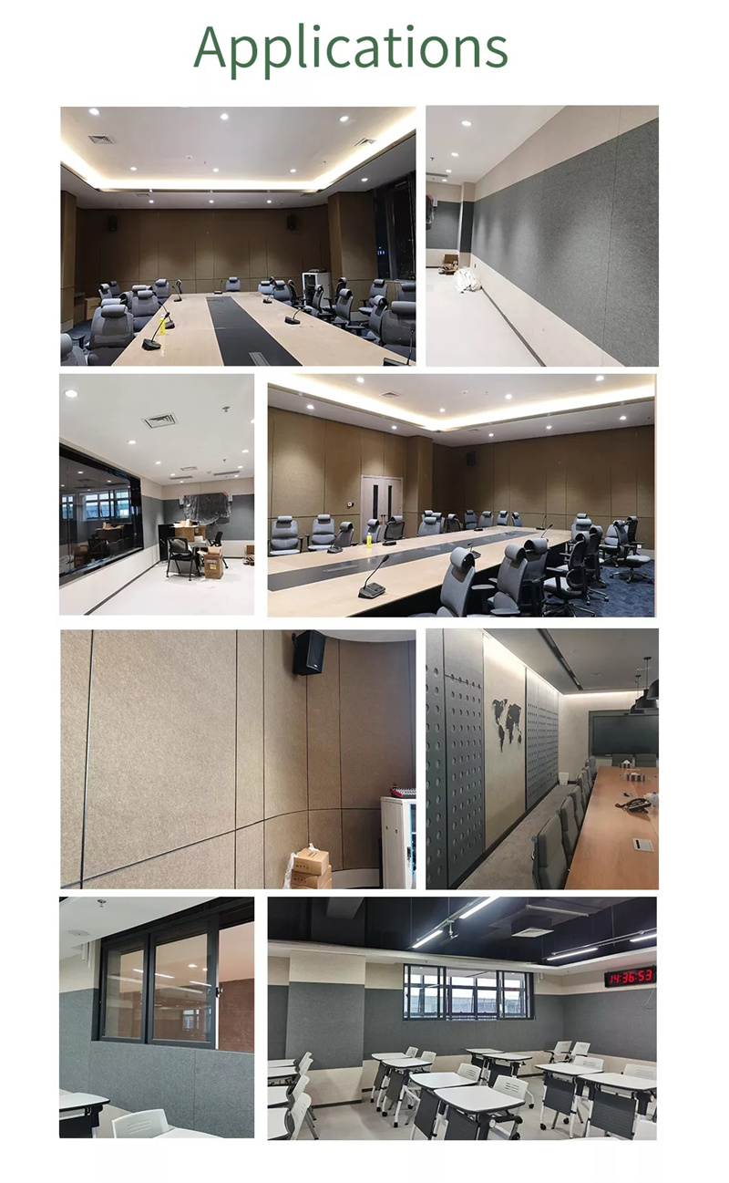 Polyester fiber sound-absorbing panels come in more than 40 colors and can be assembled into various patterns. The surface shapes are flat, square (mosaic), wide strips, and thin strips. The plate can be bent into a curved shape. It can make the indoor figure design more flexible and changeable and effective. It is even possible to copy art paintings on a polyester fiber sound-absorbing panel through a computer.